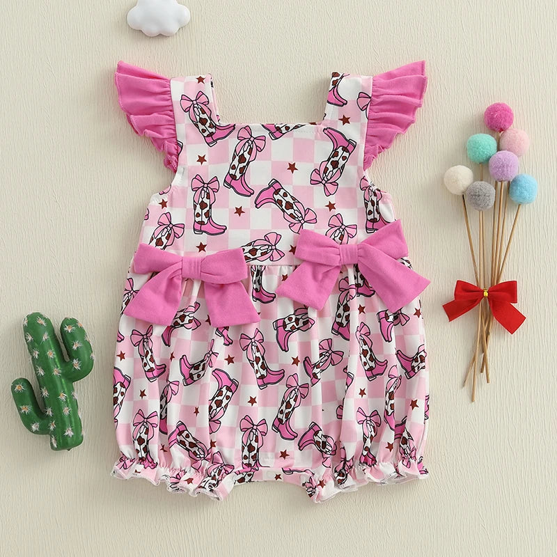 Baby Girls Romper, Fly Sleeve Square Neck Plaid Boots Print Infant Bodysuit Summer Clothes for Casual DailyThe cute and fashionable infant baby girl romper must be a wonderful present for your baby. A perfect choice for keeping your little one cool and comfortable during the hot summer months.
