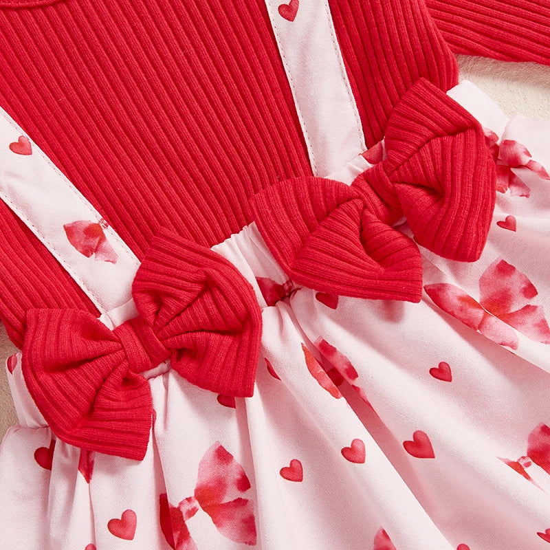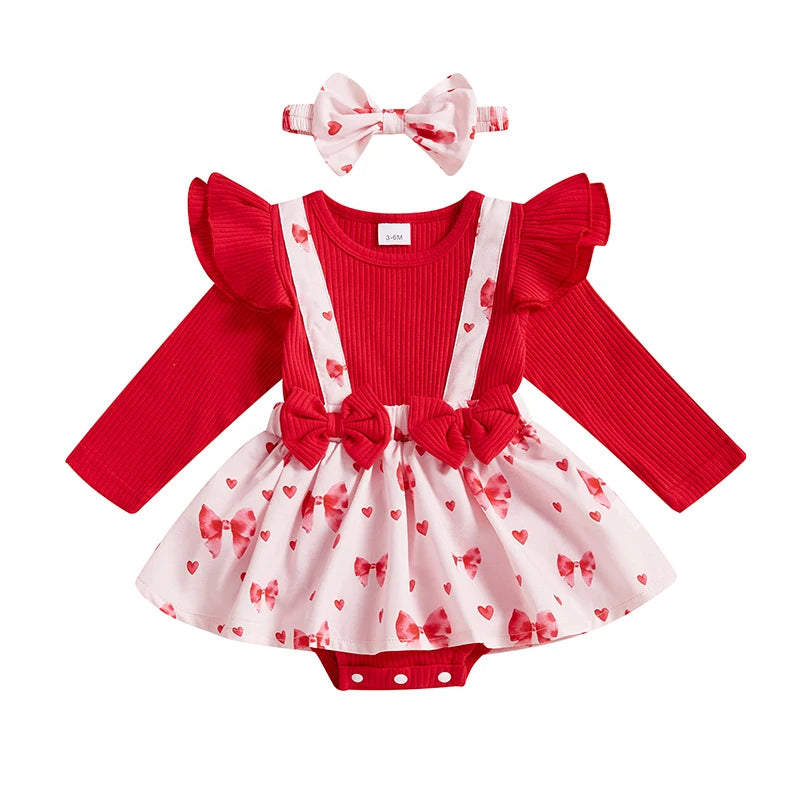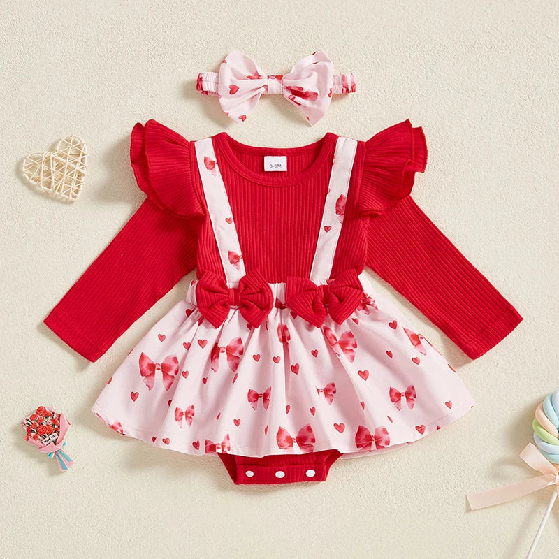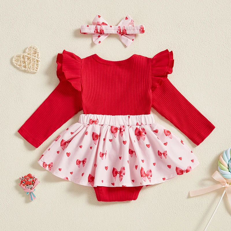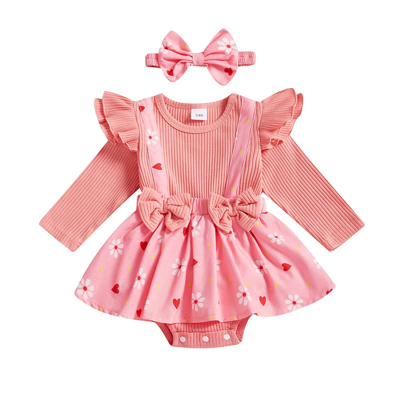 Baby Girls Valentine Romper Dress Bow/Flower Print Ruffles Long Sleeve Jumpsuits and Cute Headband SetFeatures