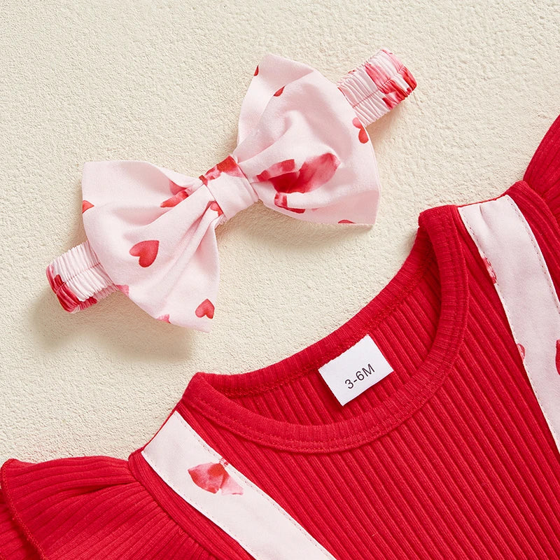 Girls Valentine's Day outfit; Toddler long sleeve romper, ribbed fabric, bow/flower print, ruffles, long sleeves, round neckline, crotch snap closure; And cute headband set, simple but fashionable, make your baby more adorable