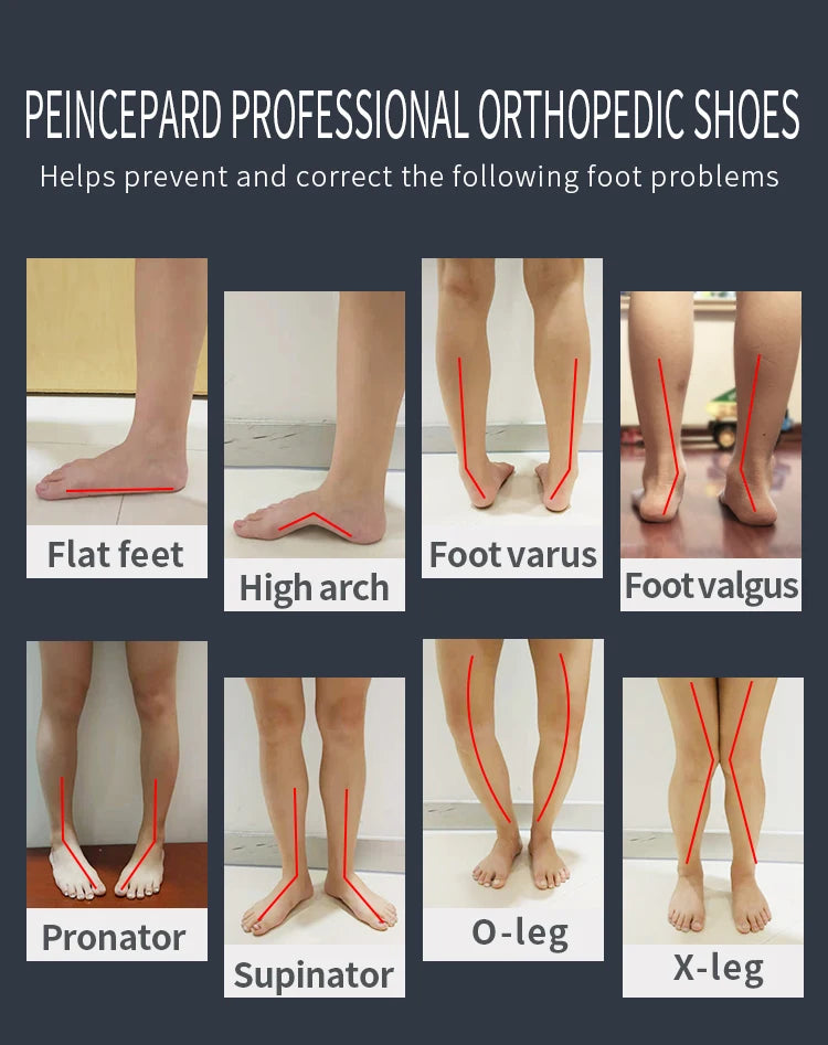 The long-term wearing orthopedic shoes can effectively correct and prevent various foot skeletal problems, like varus foot, valgus foot, flat foot, in-toeing gait, out-toe gait, O-shaped legs, X-shaped leg. It benefits a lot to the correction and improvement of thenature and nurture bone problems.