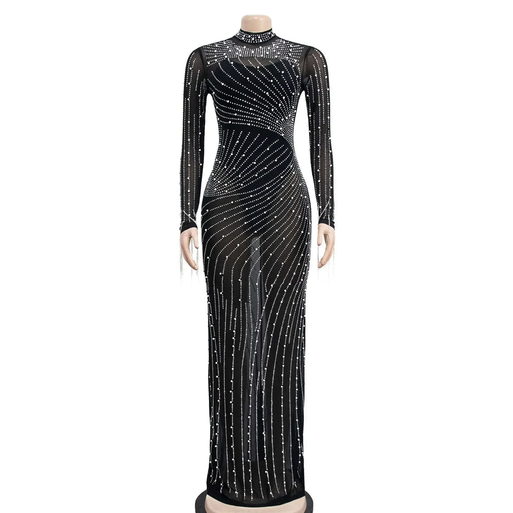 CM.YAYA Women Mesh Tassel Long Sleeve Diamonds Hot Rhinestones Bodycon Midi Maxi Long Dress and Tank Inner Dresses 2piece Suit