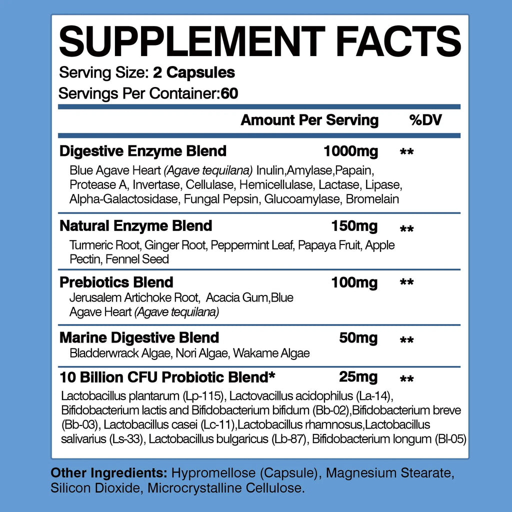 Ingredients: Digestive enzymes, prebiotics, probiotics