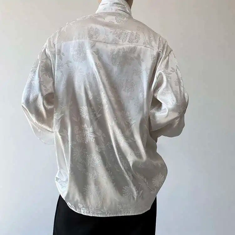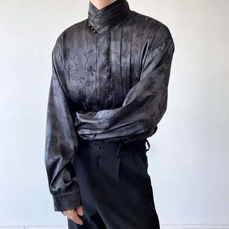 IEFB Chinese Pleated Stand Collar Jacquard Satin Trend Men's Shirt Long Sleeved Fashionable 2025 Spring Male Tops Solid Color