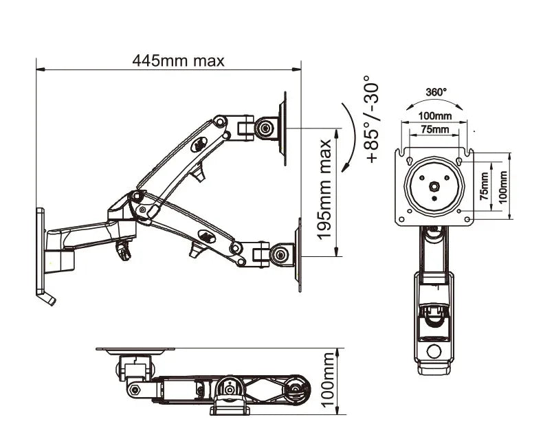 F300 is a wall mounted full motion LED, LCD TV or display mount. It is designed and built with concepts to enhance your viewing and gaming experiences. Constructed in aluminum alloy and built in durable gas spring cylinder, tilt, swivel and height can be position as wish for maximum comfort. Added unique pivot joints design offered 180° swivel and effortless tilting positions to eliminate gray viewing angles. Whether for entertainment, video conference, gaming or real time exercising with your idol, F300 is almost covered up every viewing spots in your room due to its versatility design. Product constructed in aluminum alloy and joined by riveting process produced a sturdy and stable universal TV mount. F300 is designed in single-arm double extension and fit most 30” – 40” TVs. Casted in a smooth arc shape with a perfect powder coated black product blends well with TV or display, ring and hood integrated cable management for a clean and clutter look.