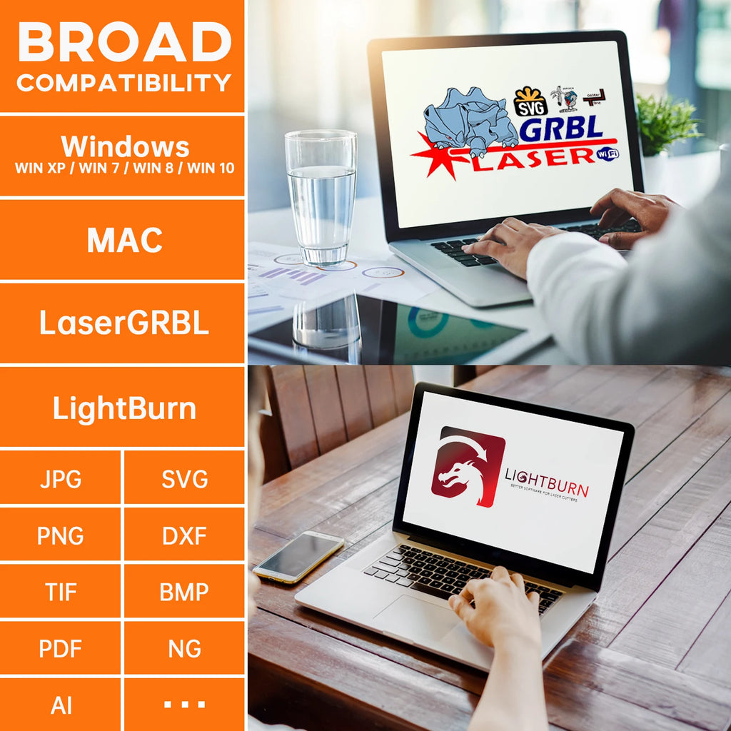 5. Wide compatibility: The machine is compatible with various mature engraving software, such as LaserGRBL, LightBurn, Benbox, GrblController, LiteFire, supports PWM mode engraving, supports Windows system, MAC system (LightBurn), and engraving file format Support JPG, PNG, DXF, SVG, AI, G-code, NC, BMP, etc.