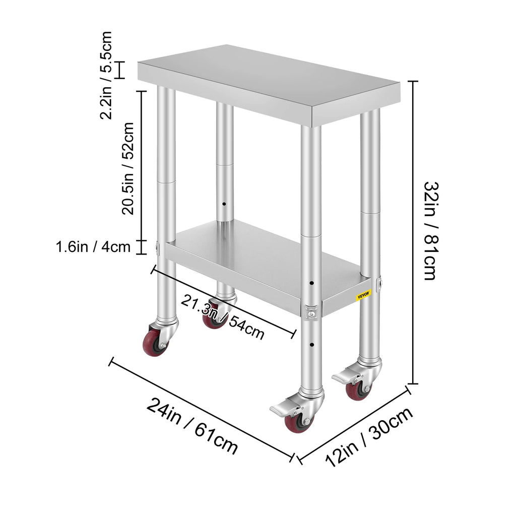 • Stable and Durable: Featuring a robust build, this work table supports up to 400 lbs on the upper shelf and 300 lbs on the lower shelf. The 4 swivel casters, including 2 with brakes, provide stability and effortless mobility, making it suitable for various settings from kitchens to workshops.