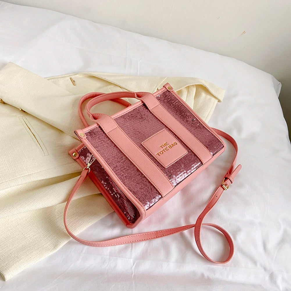 Women Ladies Handbags PU Leather Sequins Top-Handle Bags Casual Fashion Shiny Portable Adjustable Straps Shopper Tote Purse