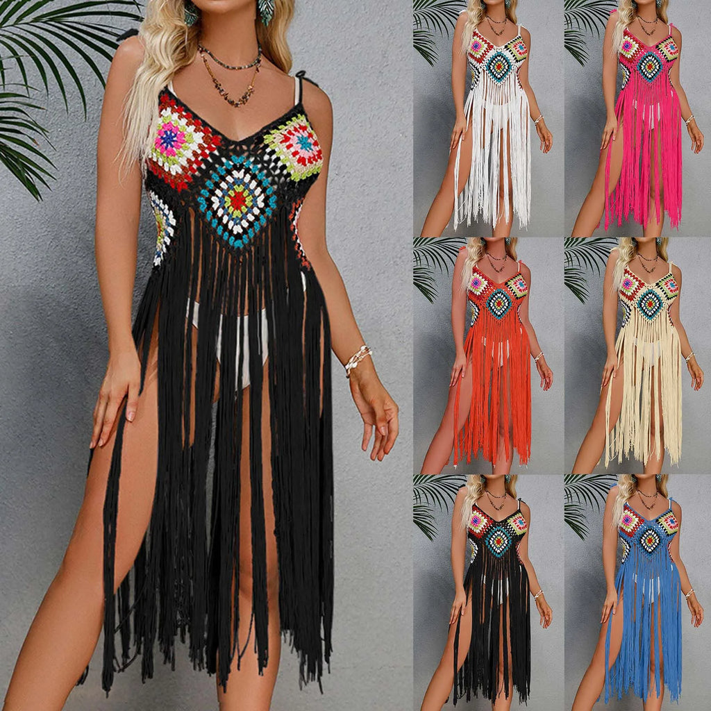 Womens Sexy Tassel Beach Swimwear Mid Length Skirt Flower Block Beach Bikini Cover Up Clothing Women'S Swimsuit 2024 Trend