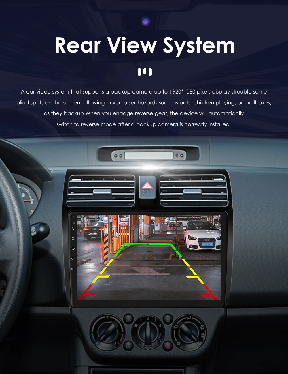 Rear View System(Rear View Camera needs to order separately): A car video system that supports a backup camera displays troublesome blind spots on a monitor , allowing a driver to see hazard such as pets ,children playing ,or mailboxes ,as they backup.