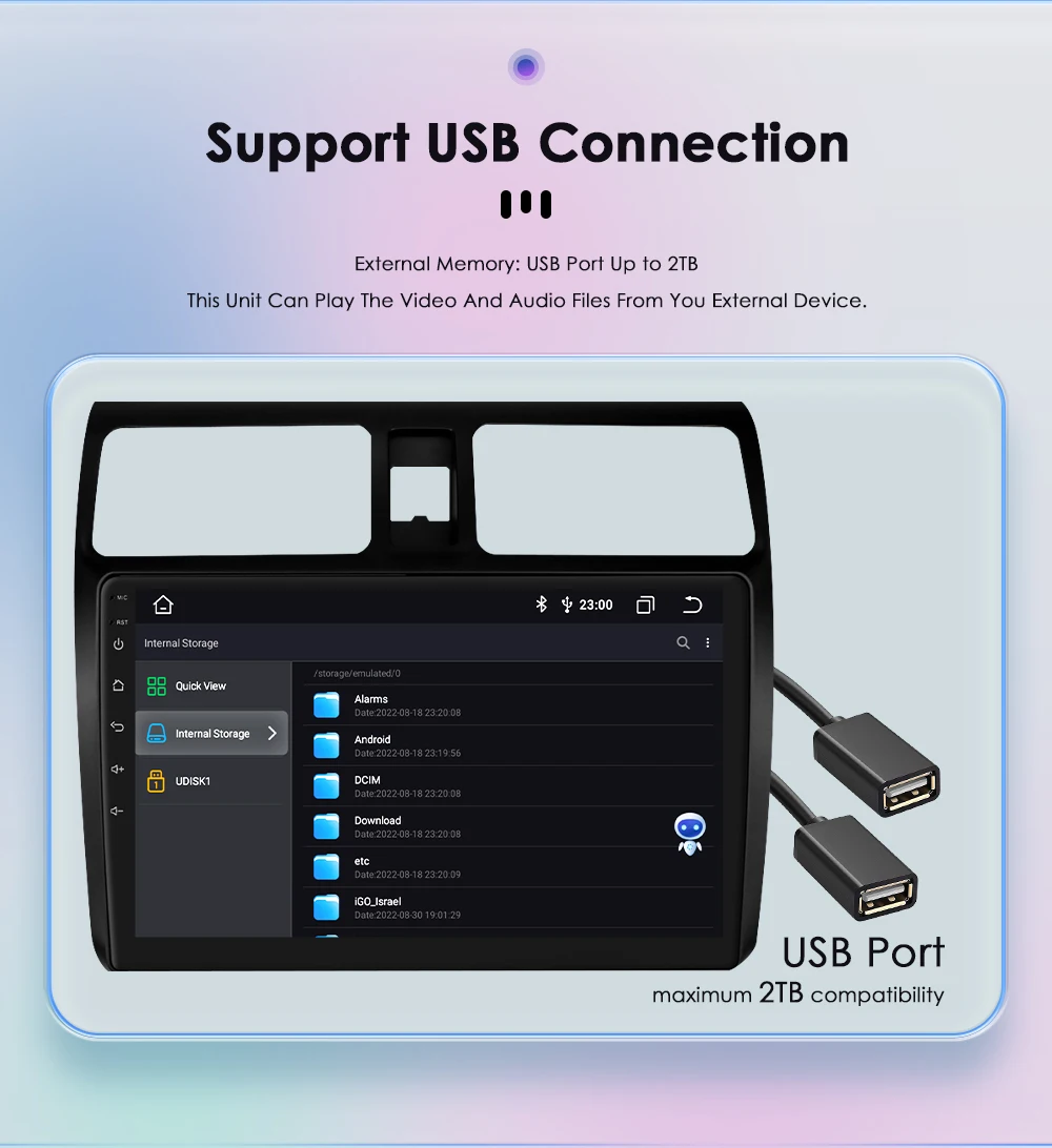 External Memory: USB port up to 2TB,this unit can play the video and audio files from your external device.