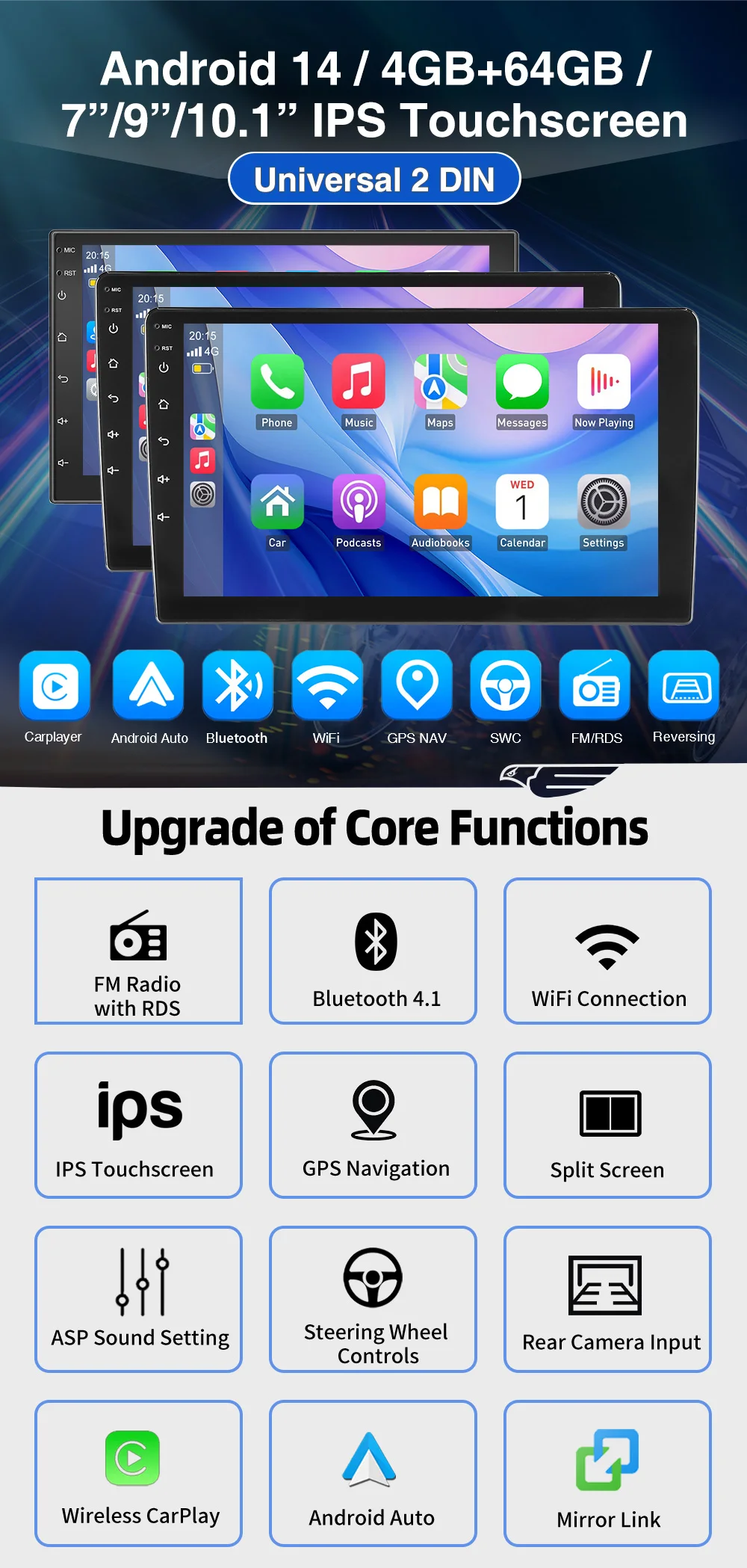 Special Features: wifi function,Support steering wheel control,Built-in GPS,MP3 players,CarPlay,android auto,Reversing Input,Split Screen