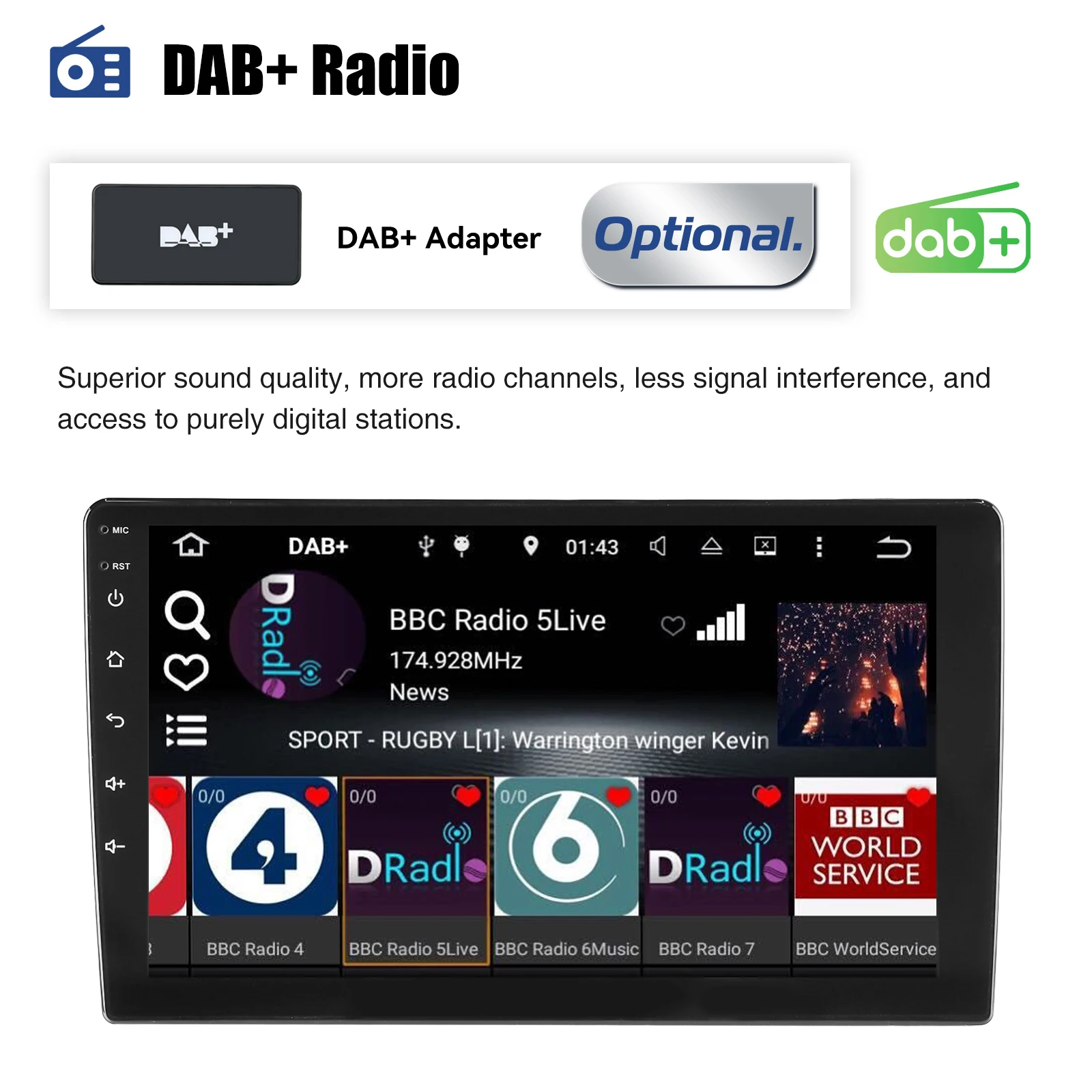 Supports DAB+ (DAB+ box is optional)-- Digital audio broadcasting enables you to enjoy multi-regional music with your local well-known and also new channels. CD sound quality and low noise with excellent transmission make DAB Radio a special experience in the vehicle. making DAB accessible to most European countries.