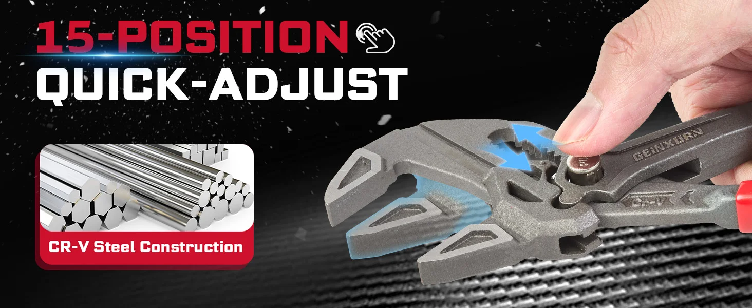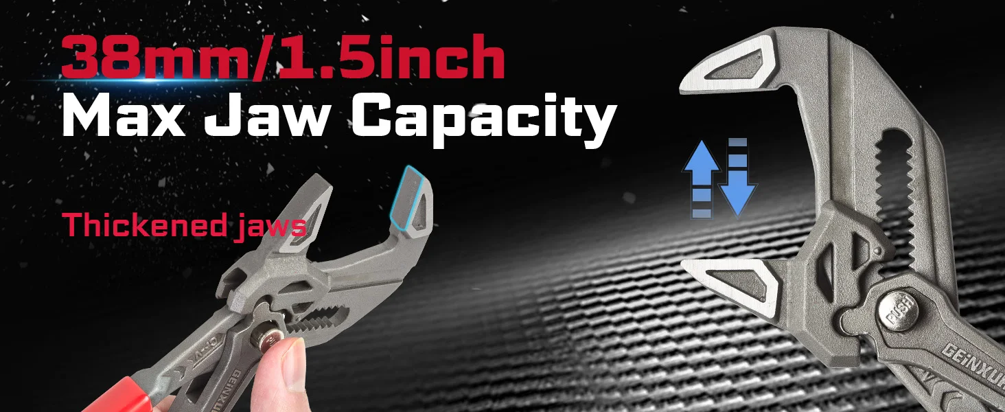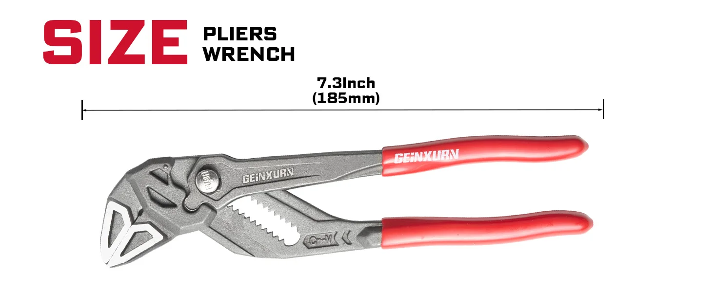 Geinxurn Groove Joint Plier7.3Inches CR-V Groove Joint Plier WrenchQuickly adapt to any task with 15 positions, built from tough CR-V steel for lasting durability.Engineered with hardened, thickened jaws to provide a secure, non-slip grip on pipes up to 38mm.Curved tooth design bites firmly into surfaces