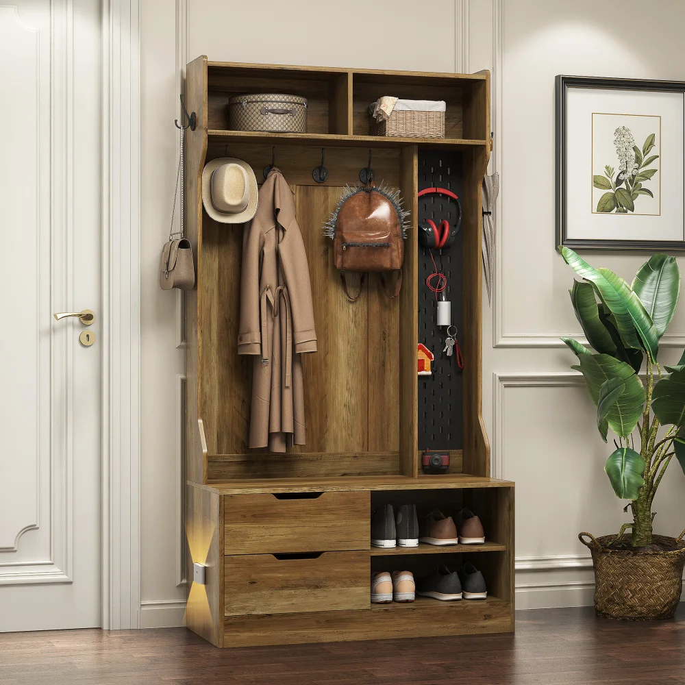 - [Practical 4-in-1 Design] This classic entryway hall tree offers shoe bench, large storage compartment, coat rack, and open shelves in a beautiful 4-in-1 package. You can effortlessly organize your entryway space without purchasing multiple pieces of furniture.