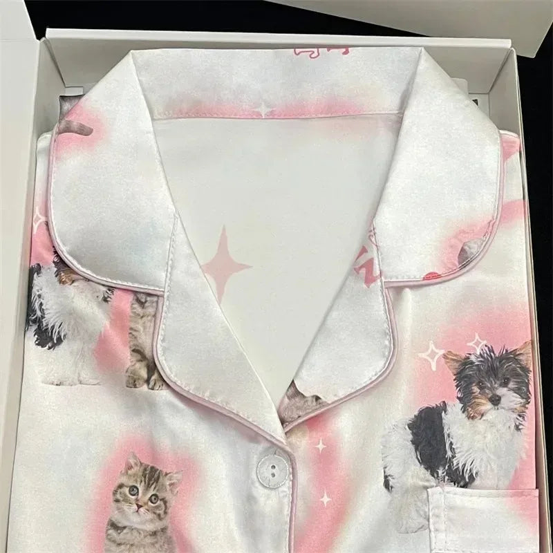 Kawaii Youth Girl's Satin Homewear Short Long Fashion Pyjama Cute Cat Print Summer New Thin Pajamas for Women Silk Home Set