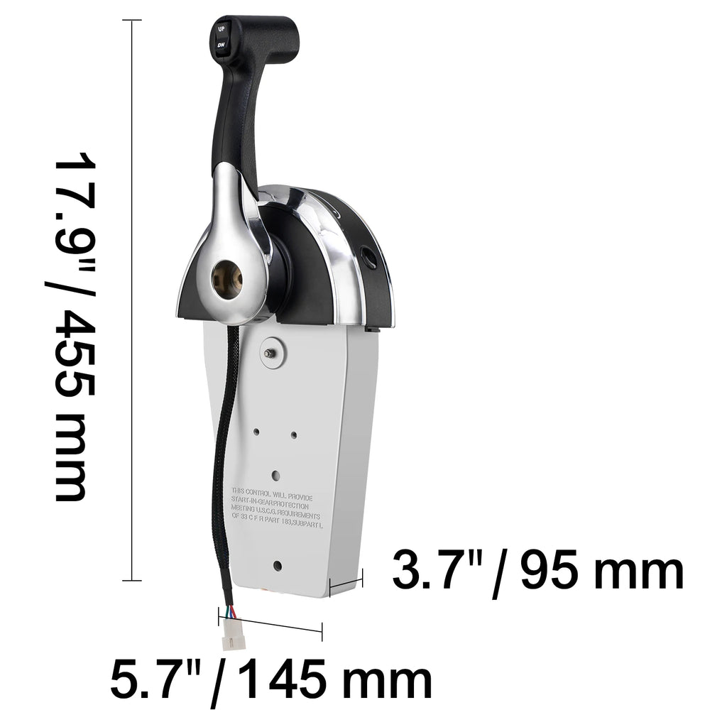 • Durable and Reliable Build: Crafted from aluminum ADC2+ASA and featuring an ABS shell handle, this top-mounted outboard remote control kit is designed for durability. The robust materials and plastic button ensure firm, reliable operation, even during frequent push-pull maneuvers. Long Control Cable for Flexibility: Equipped with two cable harness options – a 2.1 ft/640 mm 6-pin connector and a 2.4 ft/740 mm 3-pin connector – this control box provides ample reach for installation. Always remember to turn off the ignition, remove the key, and disconnect cables before measuring cable lengths. Emergency Stop Lanyard for Safety: This throttle control box features a built-in emergency stop switch with a lanyard. It automatically halts the engine if the driver is displaced, enhancing safety. The lanyard can be attached securely to the driver's wrist or waistband. Smooth Gear Shifting Control: For precise gear shifting, press the neutral release button to engage gear, then push the control lever forward for forward gear and backward for reverse, both by approximately 35°. The friction adjustment knob allows fine-tuned control of speed and thrust. Trim and Tilt Adjustment for Flexibility: The power trim and tilt switch on the control lever handle lets you easily adjust the position of the stern engine. Use the ""↑"" button to tilt upward and ""↓"" to tilt downward, optimizing engine performance during loading/unloading and minimizing engine submersion.