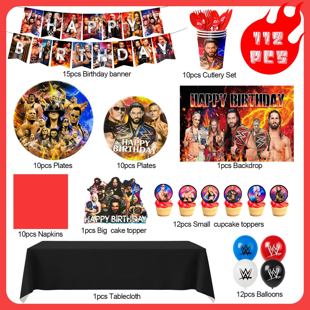 Our Wrestling themed party supplies set includes 1Wrestling themed banner, 1 Wrestling themed backdrop, 1 Wrestling themed tablecloth, 10 7'' Wrestling themed plates, 10 9'' Wrestling themed party plates, 12 Wrestling themed birthday balloons, 12 Wrestling themed birthday cake decorations etc Wrestling themed birthday party supplies.