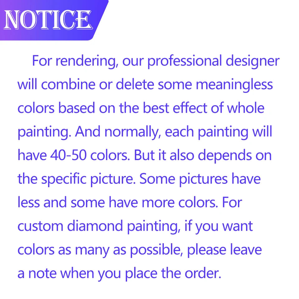 Diamond painting is such a product that the color of final rendering cannot be exactly same as that in the original picture. Please kindly understand. But our professional designer will try his best to make the color be as close as the original color.