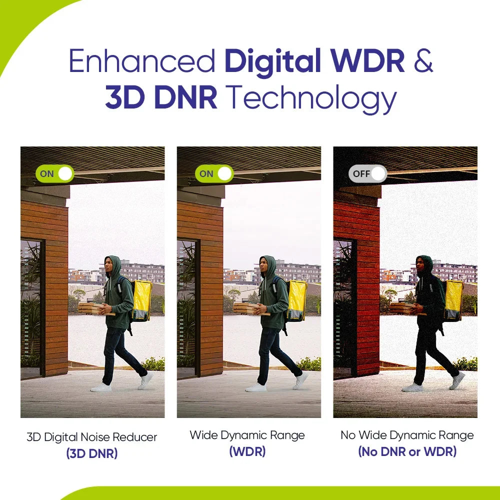 【100 ft Clear Night Vision 】The smart IR LEDs enable the CCTV surveillance camera to capture sharp images even from up to 100 ft away in almost complete darkness. The 3D DNR & digital WDR remove the image noise, delivering sharp night vision images.