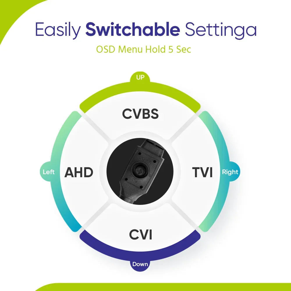 【Powerful 4-in-1 Compatibility】 This security camera supports AHD/TVI/CVI/CVBS video output, and is compatible with SANNCE DVRs and third-party DVRs for 24/7 recording. Access the OSD menu directly to change the video output mode by controlling the button on the cable.