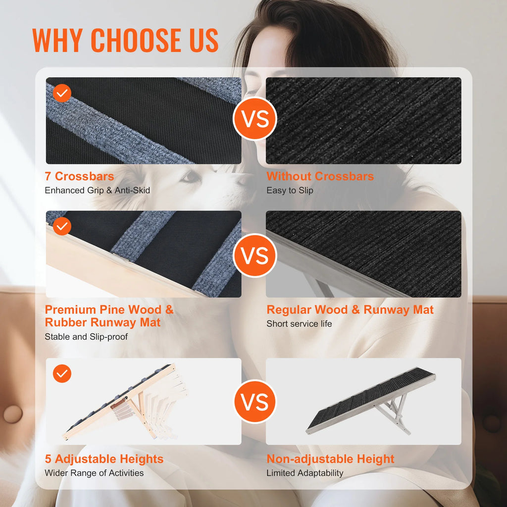 High Traction & Non-Slip Surface: The dog ramp features a high-traction rubber carpet with grooves, providing your pet with a secure and non-slip surface. The ramp's design includes 7 crossbars that offer added grip to prevent slipping and falling during climbs.