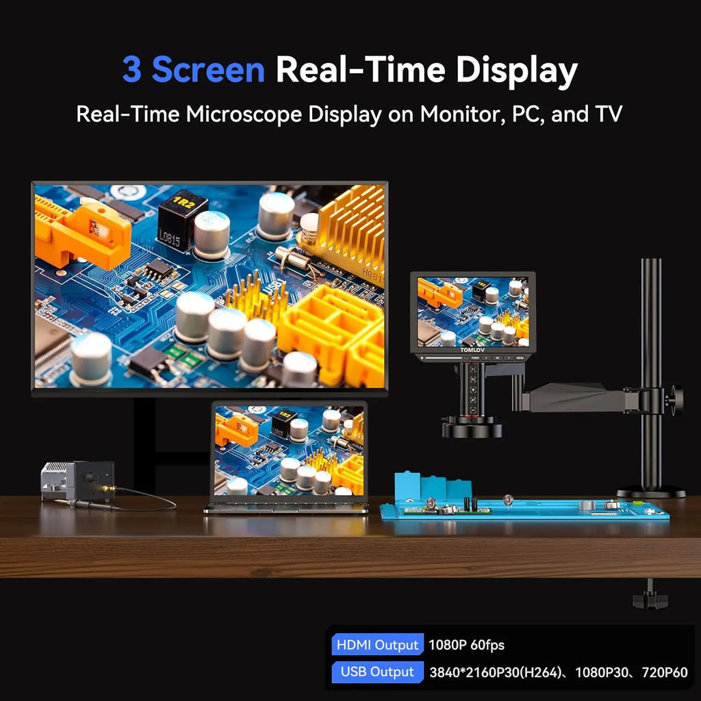 【 3 Screen Real-time Display HDMI Microscope】Elevate your soldering and inspection tasks with the TOMLOV autofocus microscope's tri-screen real-time display. Enjoy simultaneous HDMI/USB output for a larger, more detailed view across multiple screens. Perfect for lab work, professional repairs, and educational settings, this feature ensures you can monitor your observations with ease and precision, enhancing productivity and accuracy.