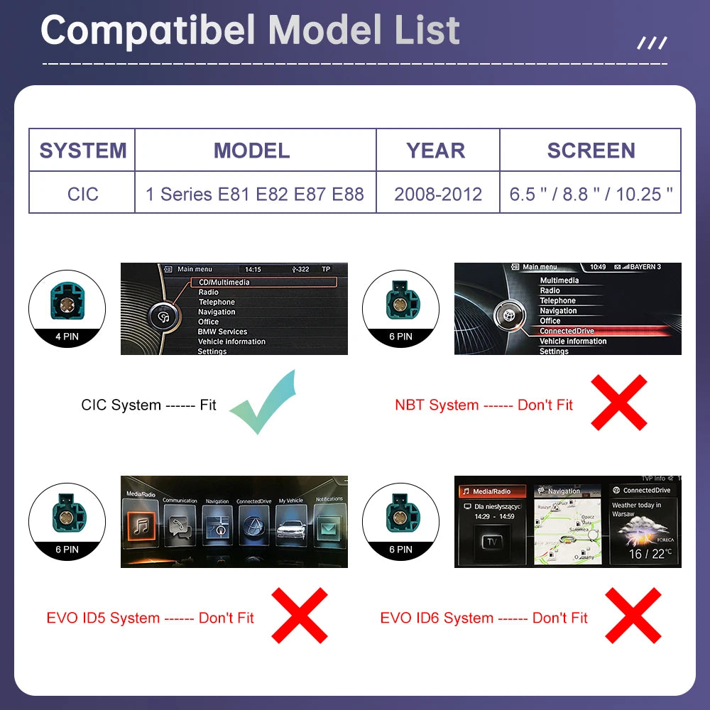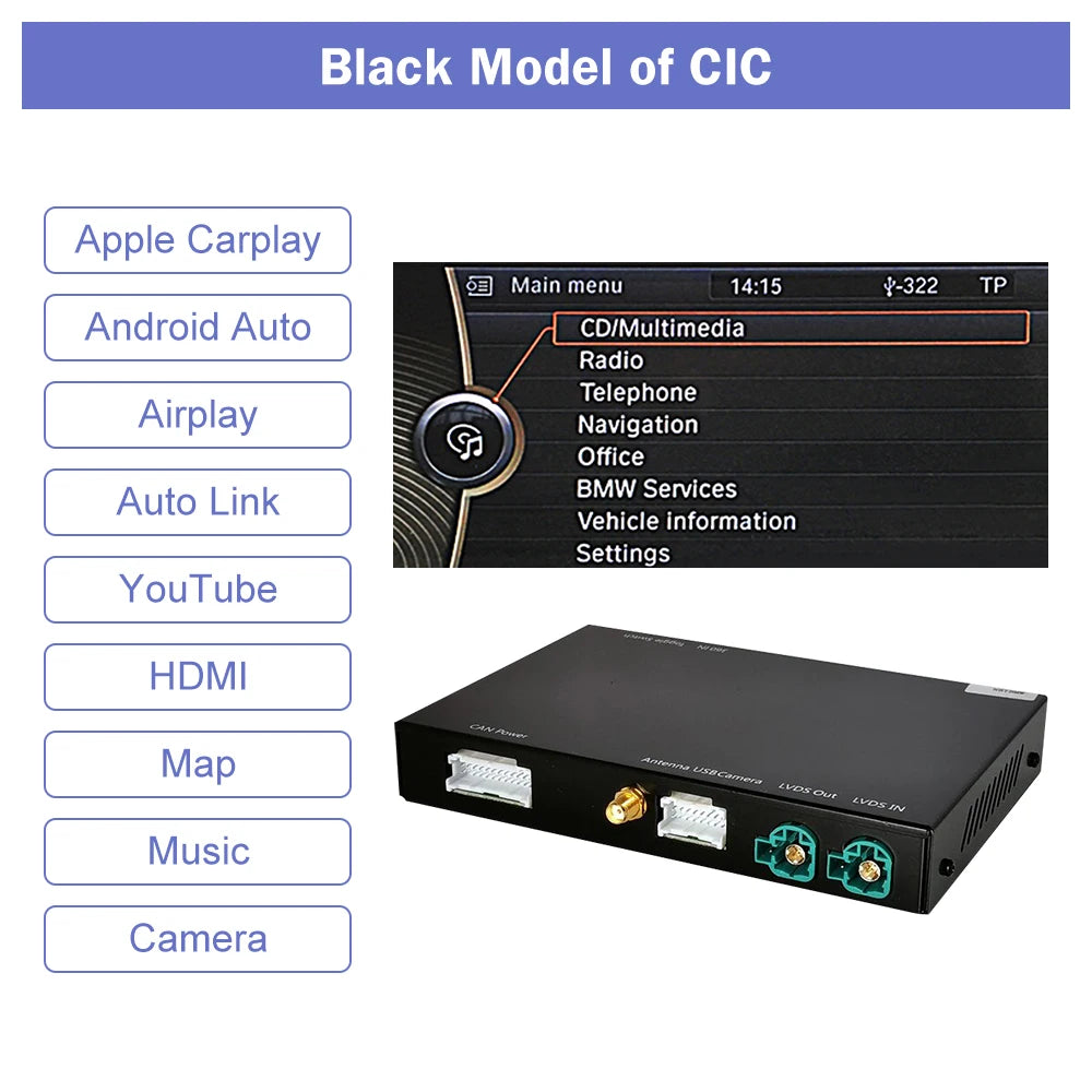 This amazing kit adds full CarPlay functionality to your existing CIC, while retaining all the original CIC features.The CarPlay system supports button and steering wheel control and is integrated with the console or glove box USB.Whether your CIC system is factory-equipped with navigation, phone module or Bluetooth, whether it's Apple Maps, Spotify, making/receiving calls or using Siri to reply to text, the system fully supports Apple systems and phone features