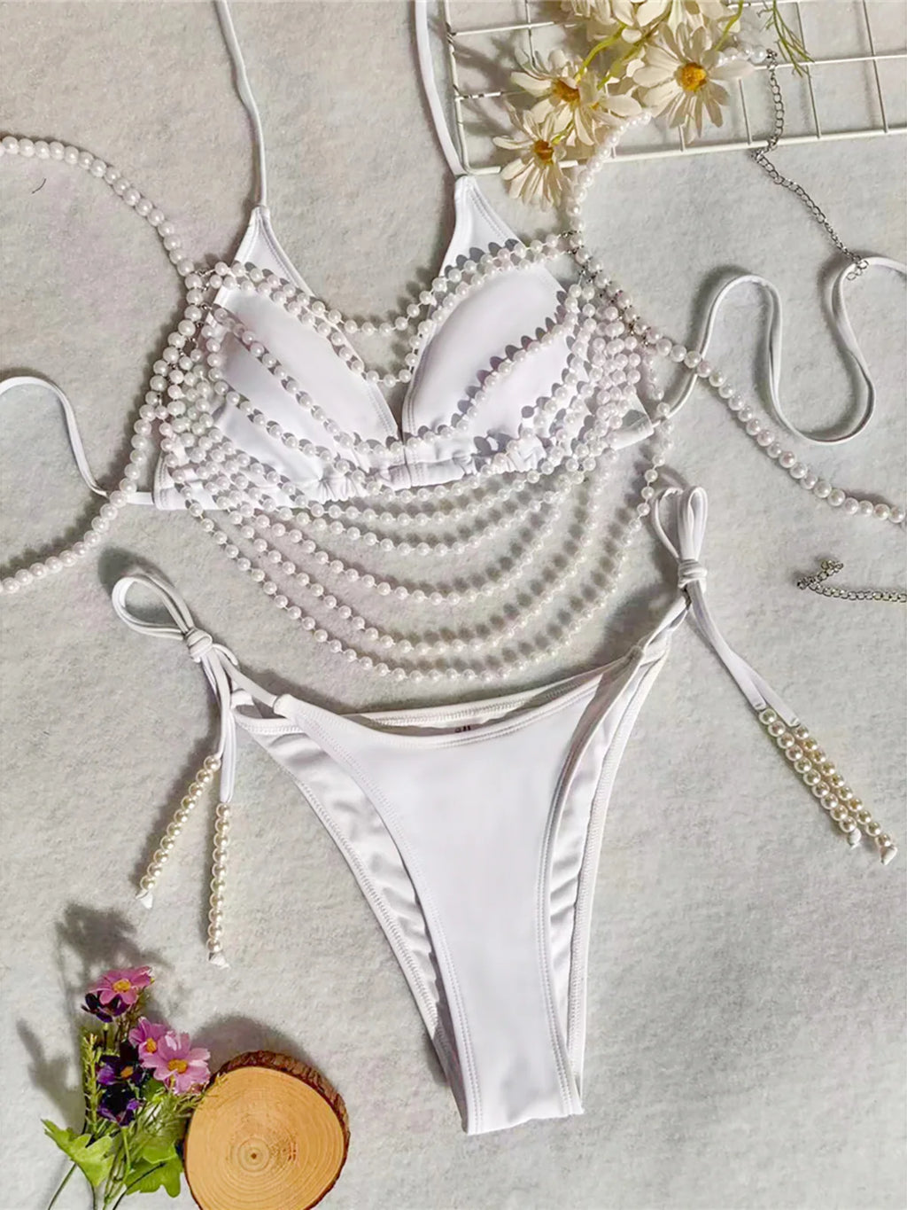 With Pearls Chains Halter High Cut Bikini Female Swimsuit Women Swimwear Three-pieces Bikini set Bather Bathing Suit Swim K5532