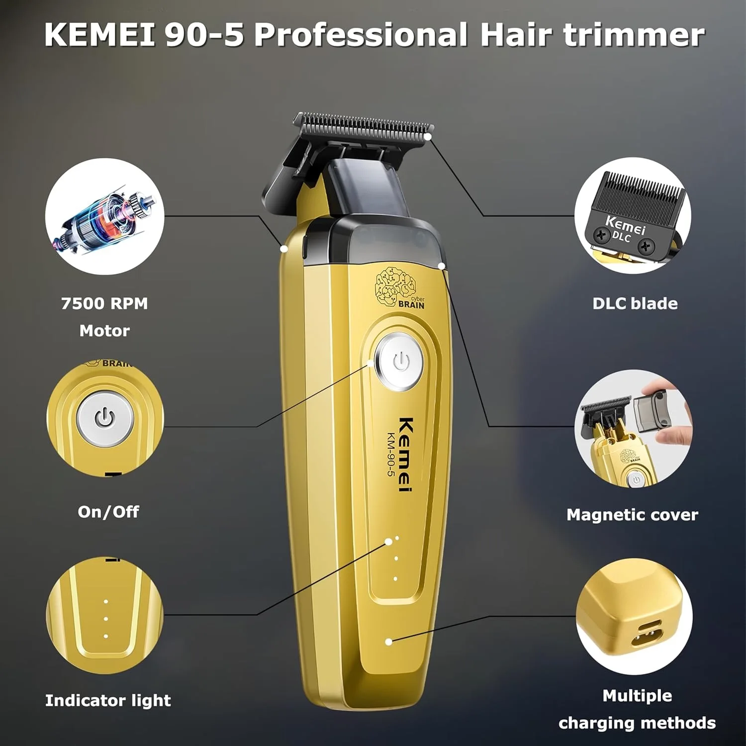 Kemei 90-5 Electric Hair Beard Trimmer for Men 7500 RPM Zero Gap Clipper DLC Blade Cordless Barber Finish Hair Cutting Machine