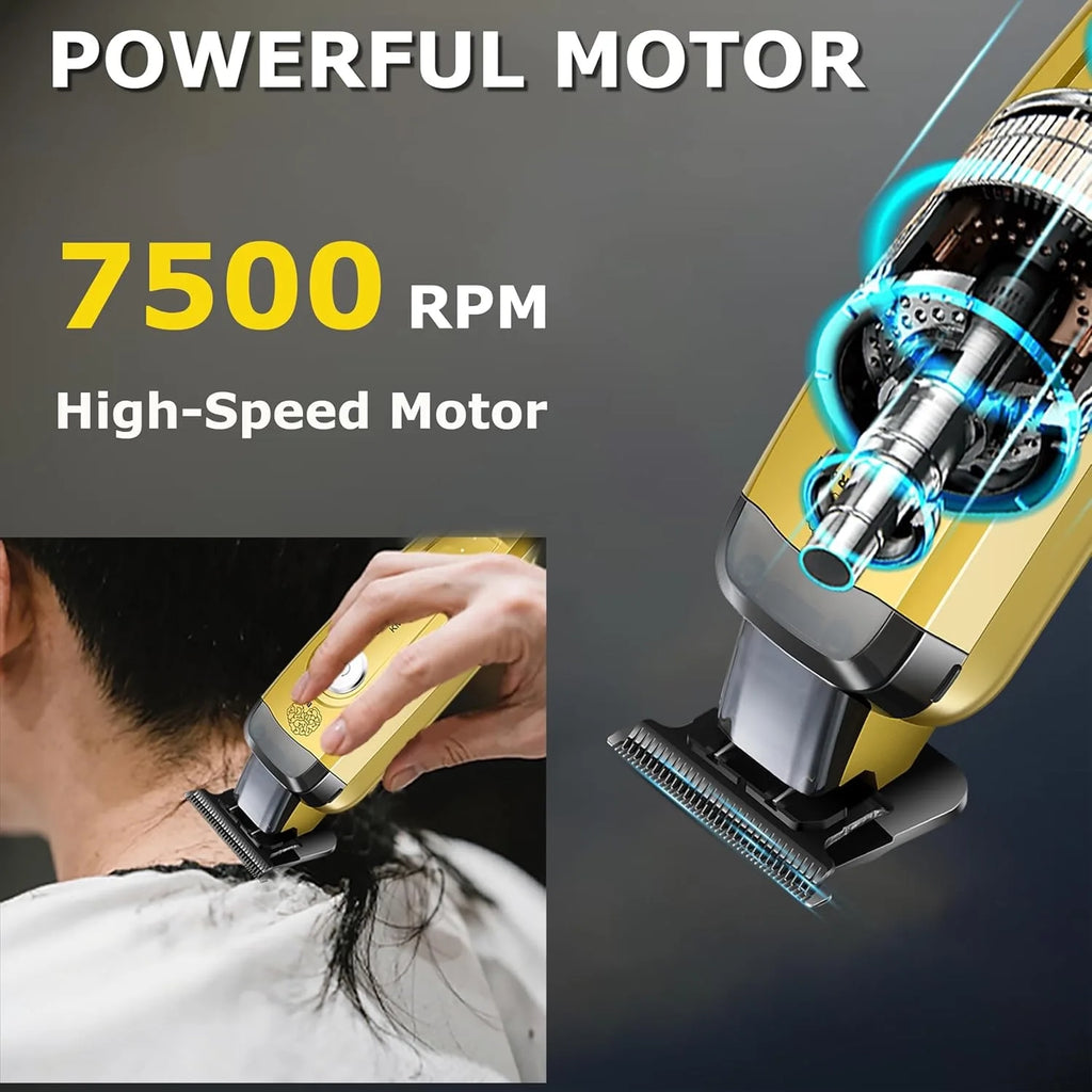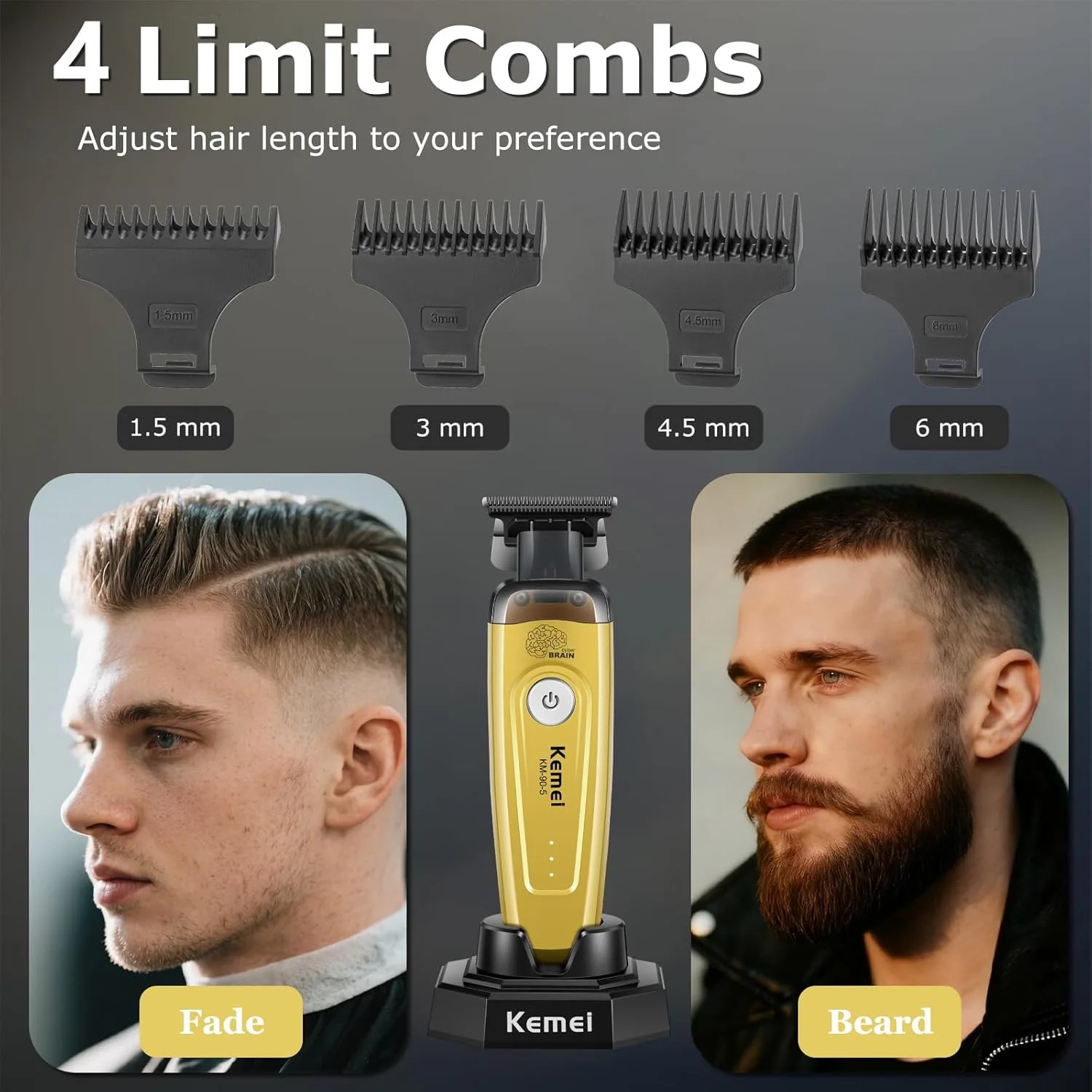 Professional Hair Clippers For Men: KEMEI 90-5 includes a zero gapped trimmer for men , 1 charging base, 4 trimmer limited combs (1.5/3/4.5/6 mm), 1 Type-C charging cable, and 1 cleaning brush. Whether you're a professional barber or cutting hair at home, the kemei trimmer will ensure a smooth, flattering cut every time