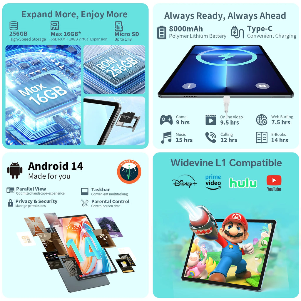 Odea S11 Tablet, 11 Inch Tddi, Android 14, (6+10)16Gb Ram, 256Gb Rom, 4g Lte, 8000Mah, 1920X1200, Unisoc T606, 8 Cores, Mali-G57, 5g Wifi, Gps, Sim Slots*2, Tf up to 1Tb, for Netflix Widevine L1