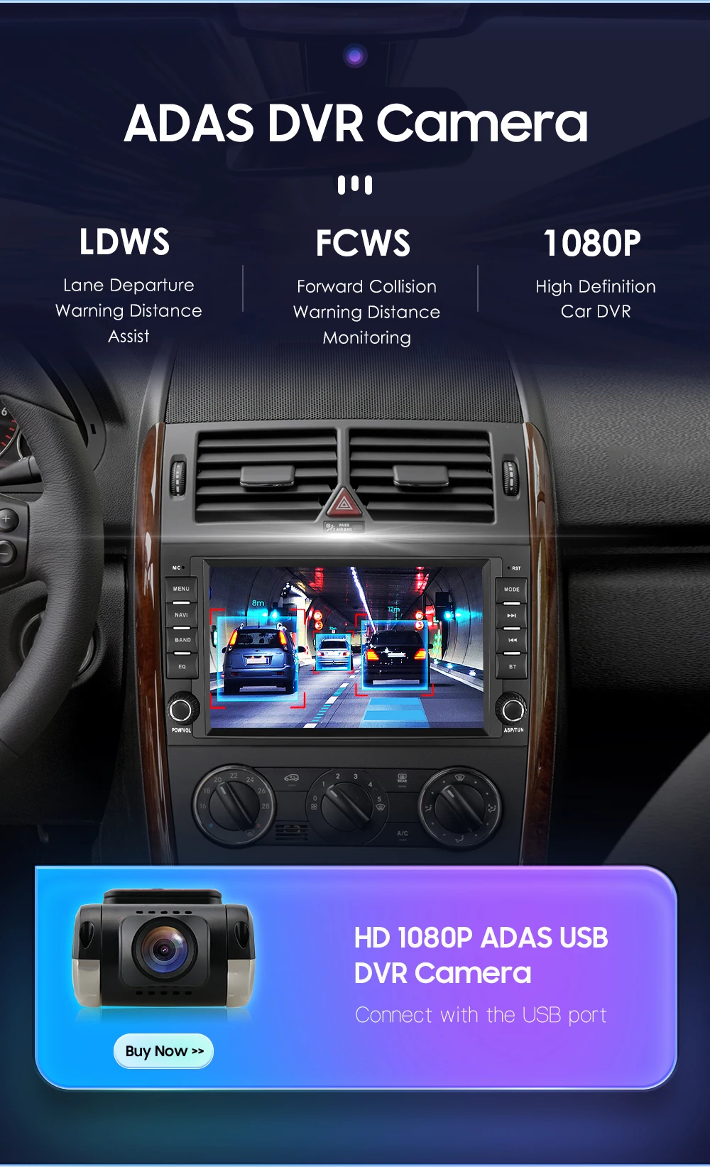 HD 1080P ADAS DVR Camera(Needs to order separately) --connect with the USB port:  LDWS(Lane Departure Warning Distance),FCWS(Forward Collision Warning Distance), 1080P(High Definition Car DVR).Rear View System(Rear View Camera needs to order separately):  A car video system that supports a backup camera displays troublesome blind spots on a monitor , allowing a driver to see hazard such as pets ,children playing ,or mailboxes ,as they backup.