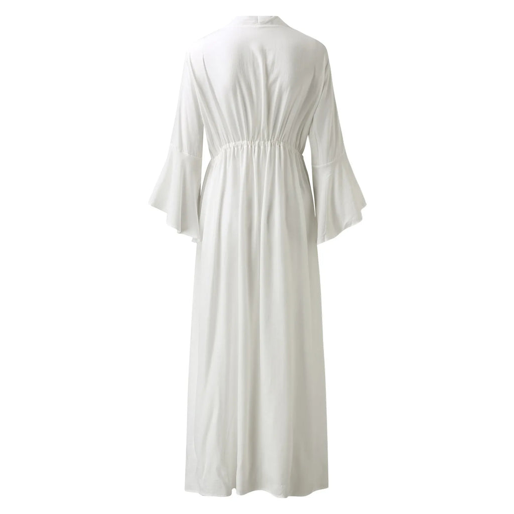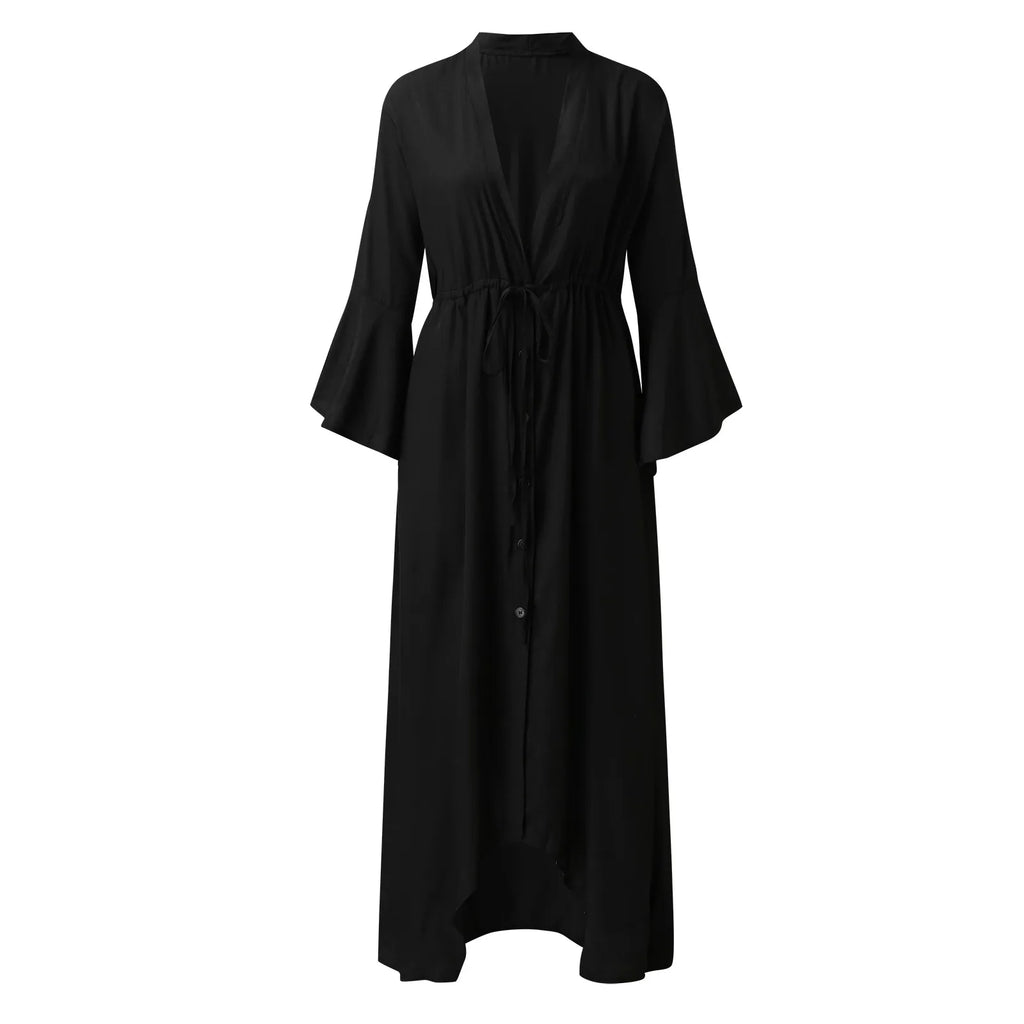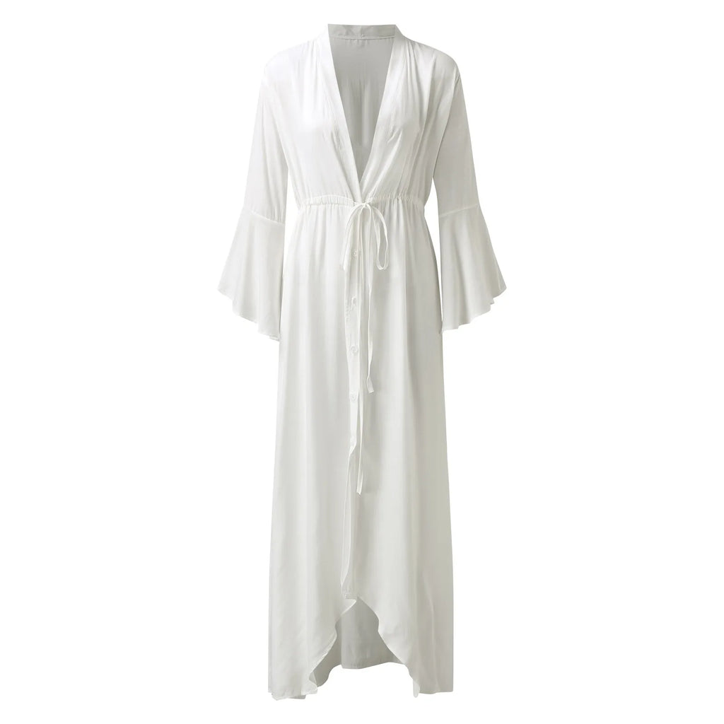 Elegant Women Beach Cover Ups Maxi Dress Ruffled Cardigan Kimono Swimwear Button Down Long Sleeve Sunscreen Solid Cover Ups