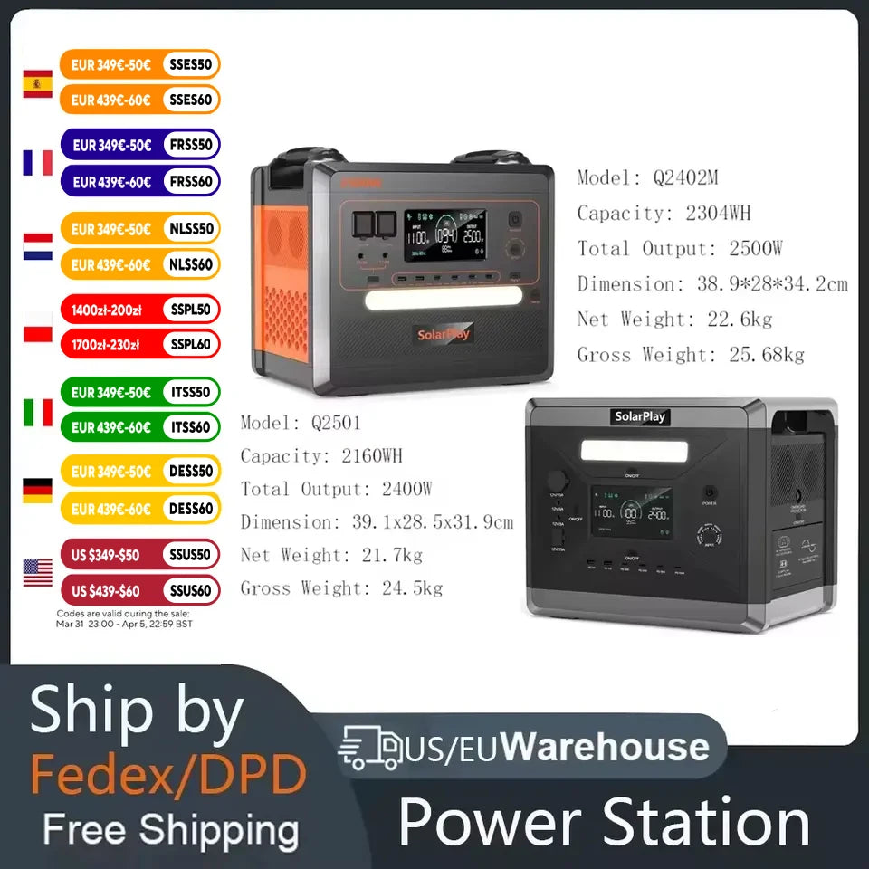 SOLARPLAY Q2501 Q2402M Portable Power Station 2160WH 2304WH LiFePO4 Battery with 2400W/2500W (4800W Peak) Solar Generator