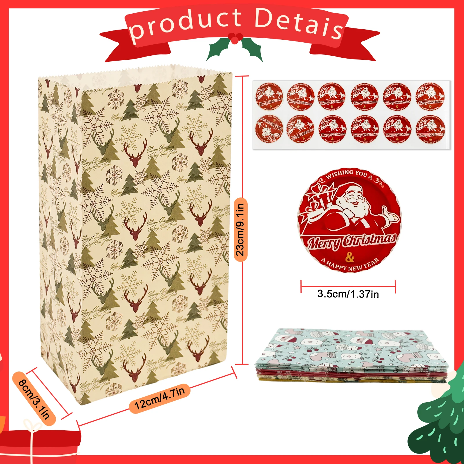 12Pcs Christmas Kraft Paper Gift Bags Snowflake Santa Claus Xmas Tree Candy Bag Cookies Packing Bags New Year Party Supplies