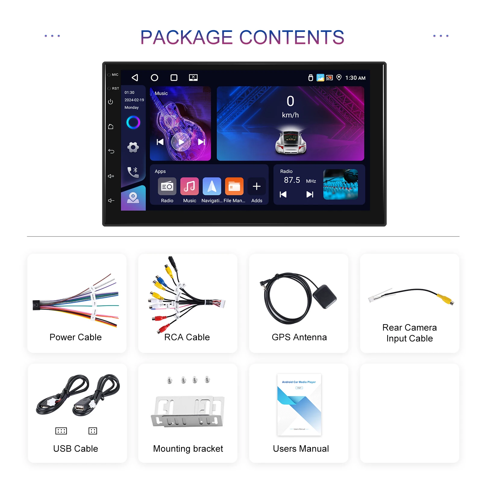 ● Double USB Port: Plug in USB flash drives or hard disks to the device via USB ports, and play music, videos, photos, etc. on the device. You can so charge your devices via USB ports.