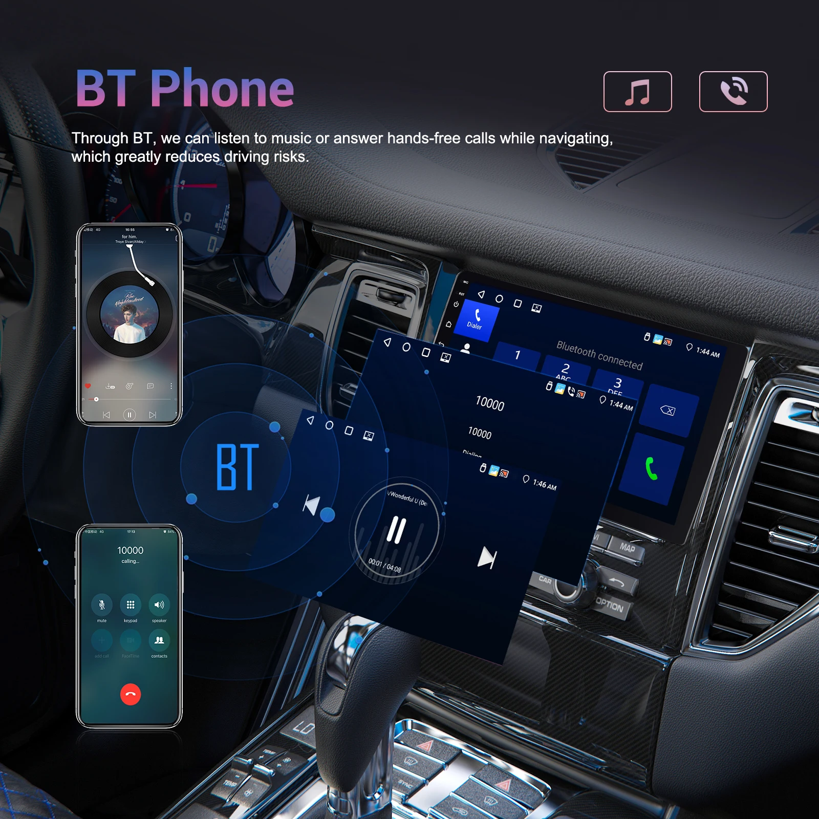 ● Wireless Carplay and wireless Auto: Use your iPhone or Android phone wirelessly with the device, and control your phone's apps. You can make calls, send messages, play music, navigation, and more with just your voice or touch.