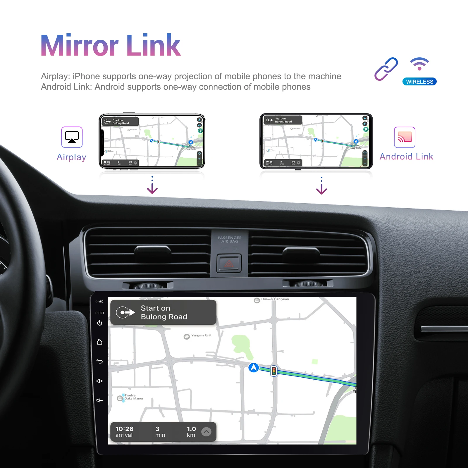 ● Mirror link: Connect your smartphone to the device via WIFI, and mirror your phone's screen on the device's display. You can use your phone's apps, music, videos, and more on the device.