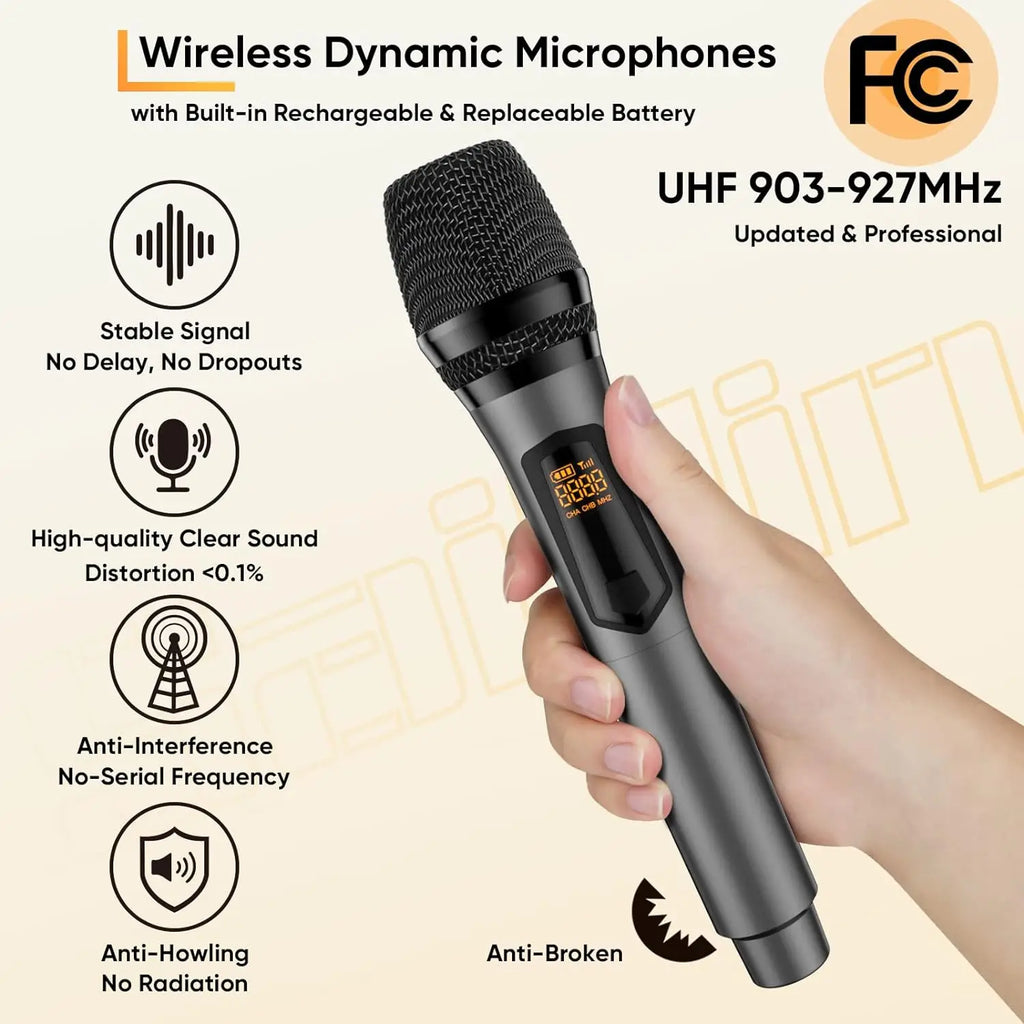 Long Working Time: This Uhf Karaoke Wireless Microphone System Is Built With Three Rechargeable And Replaceable Batteries Inside Double The Microphones And Receivers(two Usb Charge Cables Included Allowing For Mic And Receiver Charge At The With the same Time); Charge For Three To Four Hours, And 他们 Run For Approximately Ten Hours, By Is The same Environmentally Friendly In Place Of Tons Of Aa Batteries! Wireless rechargeable microphone system for karaoke: updated uhf microphones support transmission distance up to 200 feet (60 m) without distortion or loss of sound. Other features like stable signal, no delay, no radiation, anti-howling, anti-jamming, distortion <0.1% and adjustable frequencies. Plug and play: the wireless mics and receiver pairs automatically once are on power. Adjustable frequency range: ch a: 903-915mhz, ch b: 916-927mhz. Not兼容bluetooth speakers,macbooks and phones.请确保您 plug in mic on speakers, not audio in, line in or aux in, otherwise no sound can be heard. Wide Compatibility: This Professional Wireless Microphones Come With A 6. 35 Mm To 3. 5 Mm Converter, Making It Accommodate More Devices Like Amplifiers, Pa System, Karaoke Machine And Powered Speakers Etc And Good For Occasions Like Conference, speech, Web Podcast, youtube Recording, Outdoor Recording, Yoga Instructor, Church,family Party, Opening Ceremony, Dancing Instructor, Promotion, Game Etc. What You Get: Two Uhf Wireless Microphones, One Receiver, Three Built-in Rechargeable And Replaceable Batteries, One Dual Usb Charge Cable, One Usb Charge Cable, One 6. 35 Mm (1/4'') To 3. 5 Mm (1/8'') Gold-plated Converter, Two Anti-slip Ring, User Manual. If you have any questions, we are always here to help. Quick troubleshooting: 1.make sure the mics and receiver have enough power; 2. Plug the receiver into a mic input, not other interfaces; 3. Turn off the microphones and receivers,然后 turn on to repair (turn the mics and receivers,然后再次打开, make sure the two mics are at different channels and frequencies. Frequency range: ch a: 903-915mhz for microphone a, ch b: 916-927mhz for microphone b,当 the green light on receiver stops flashing,它们已成功 connected. Note: Please Turn Down The Volume Of Mic Input On Your Speaker Or Amp To The Lowest Before Plugging The Receiver,and Then Turn On The Mic, Turn On The Receiver, Then Turn Up The Mic Input Volume Slowly To Avoid Speaker Screech Or Damage To Amplifier. Please Place The Mic Right Under Your Mouth For Better Sound.