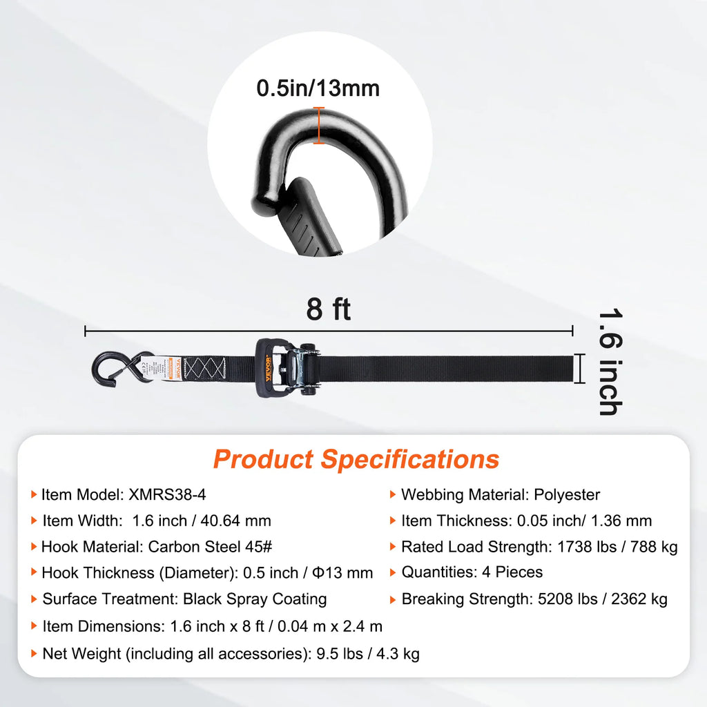 Powerful 2200/5208 lbs Breaking Strength: The webbing is made of high-quality material with additional stitching, providing unbeatable performance even when handling heavy loads in strong winds. Each ratchet has an official load capacity of 733/1738 lbs and a breaking strength of up to 2200/5208 lbs