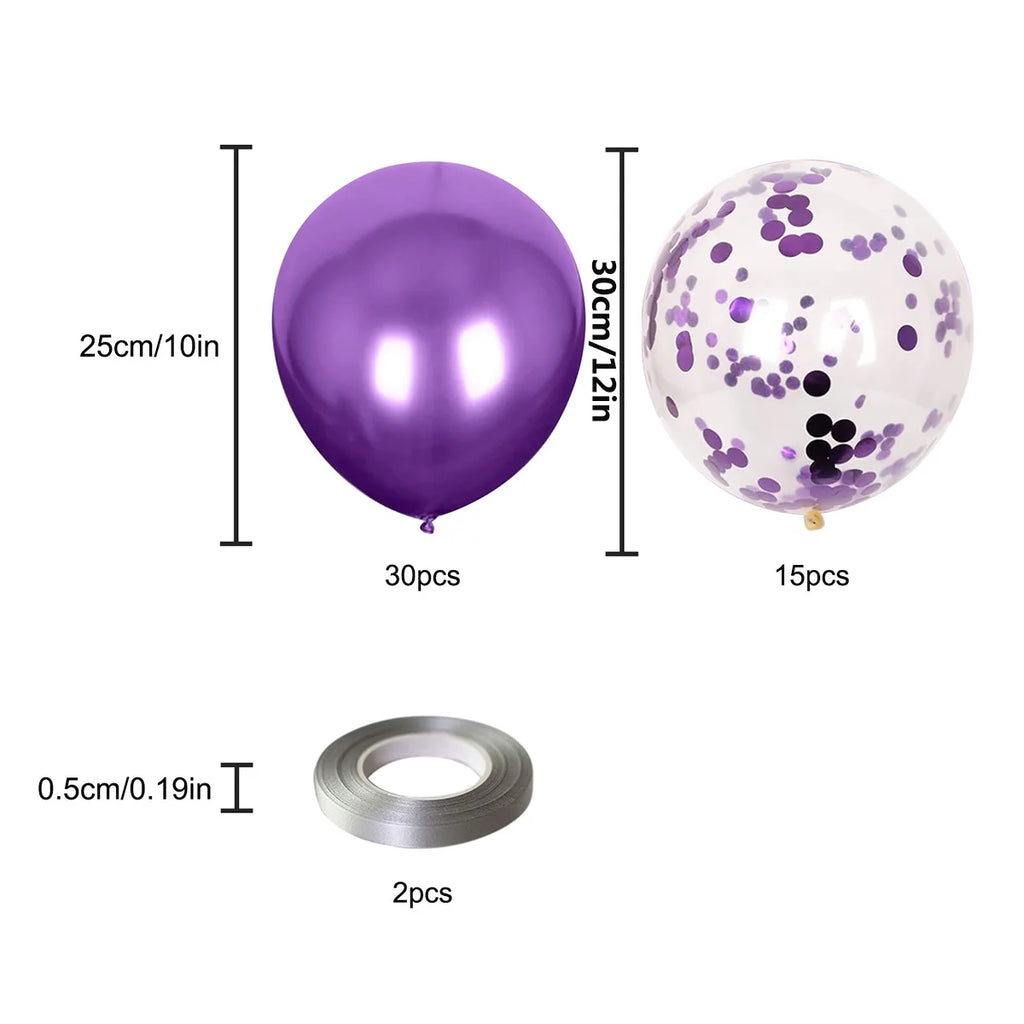 [ Premium Value Pack ] - This metallic purple balloons set is a new combination of purple metallic balloons and purple confetti balloons; 30pcs 10 inch purple metallic balloons, 15pcs 12 inch purple confetti balloons, and 2 silver curling ribbons for you to throw a memorable party