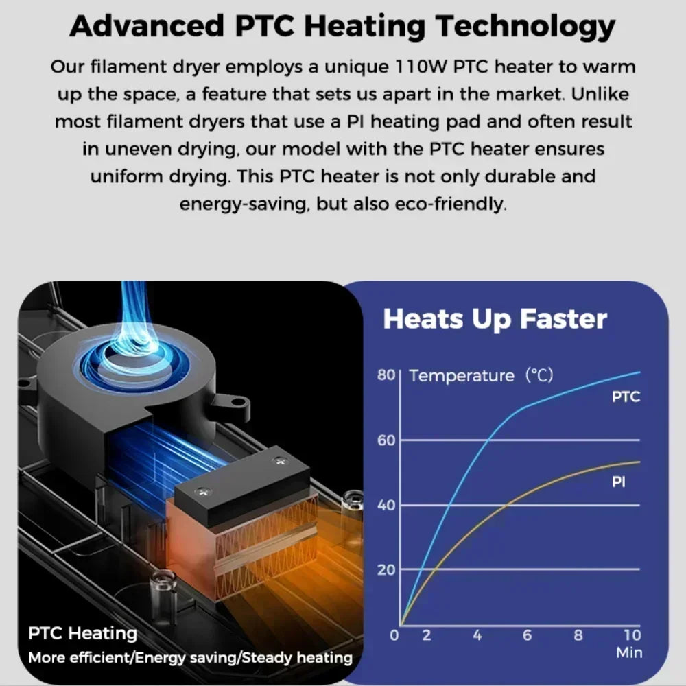 Our filament dryer employs a unique 110W PTC heater to warm up the space, a feature that sets us apart in the market. Unlike most filament dryers that use a Pl heating pad and often result in uneven drying, our model with the PTC heater ensures uniform drying. This PTC heater is not only durable and energy-saving, but also eco-friendly.