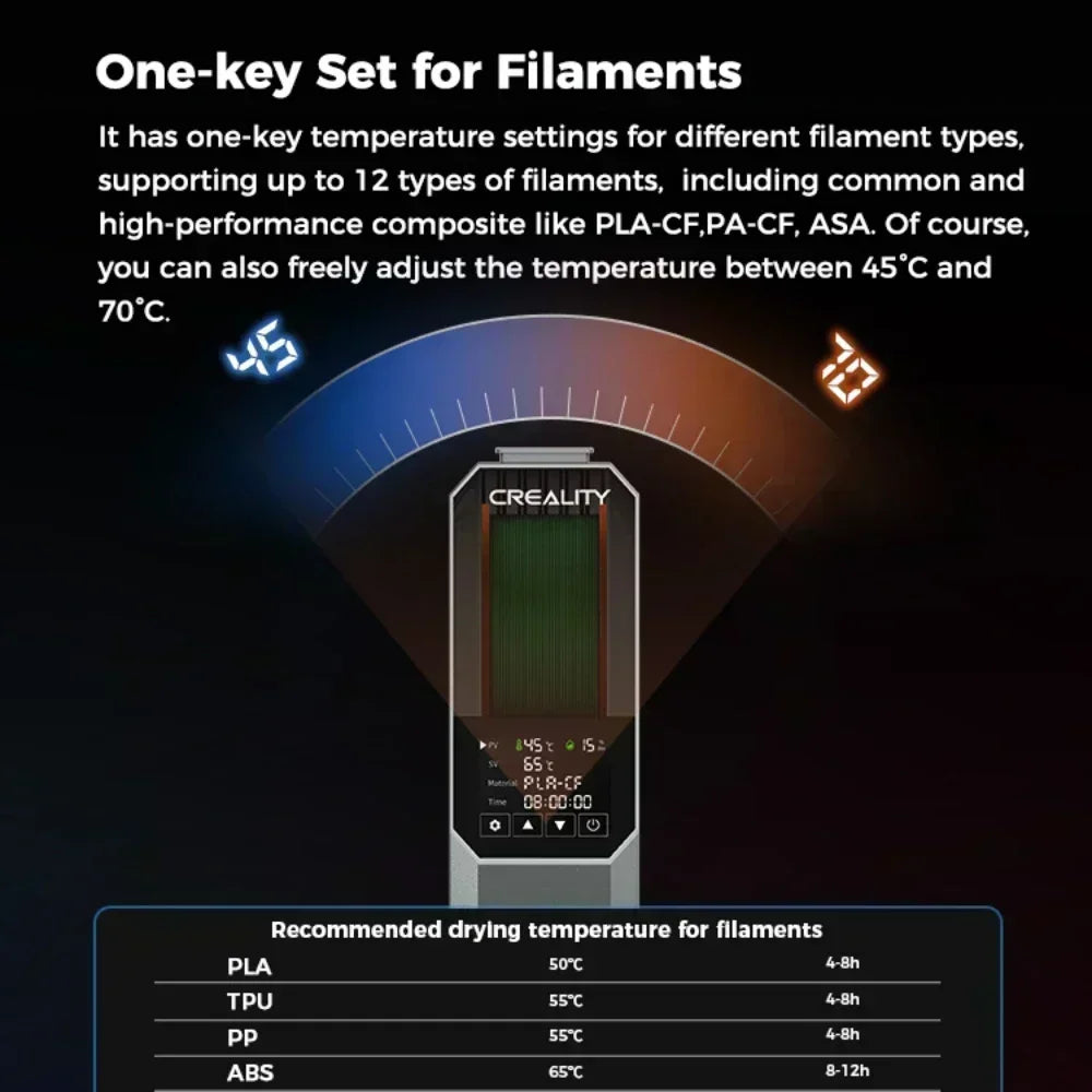 It has one-key temperature settings for different filament types,supporting up to 12 types of filaments, including common and high-performance composite like PLA-CF.PA-CF, ASA. Of course, you can also freely adjust the temperature between 45°C and 70°℃.