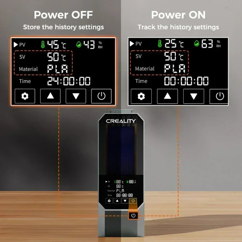 After a power outage, the machine can restart and still remember your previous material and temperature settings, eliminating the need for resetting and allowing for quick drying.