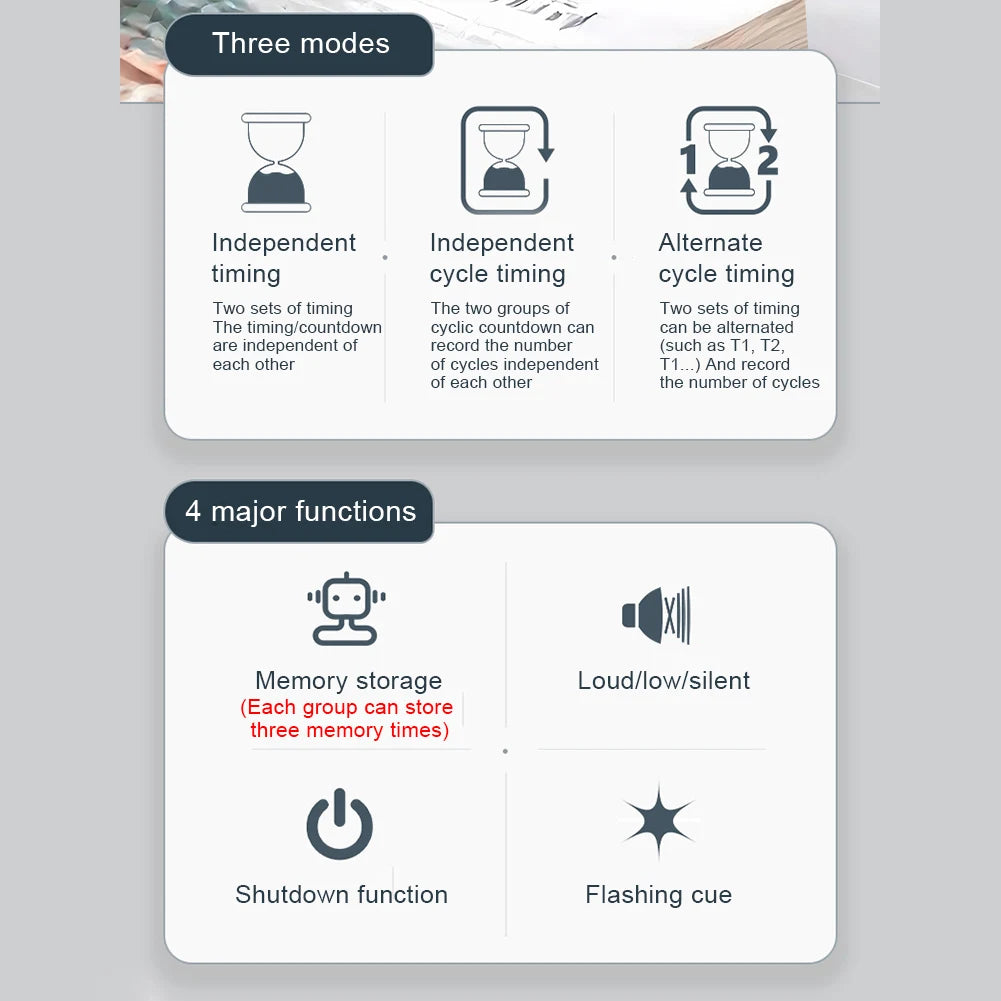 3.Customizable Alert Modes: Choose from loud flash, soft flash, silent flash, or shut-off modes of the 3 channel timer to suit any environment. Whether in a bustling kitchen or a quiet study room, this timer adapts to your needs with ease.