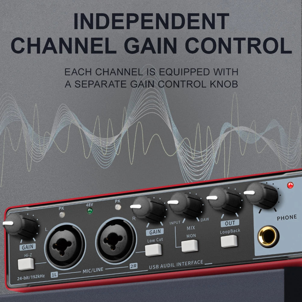Feature: 1. High-Fidelity Audio Quality: Experience studio-grade audio with a maximum sampling rate of 24-bit/192kHz by sound card, capturing every detail of your recordings with exceptional clarity and fidelity. 2. LOOP BACK Functionality: The MD22 audio interface supports LOOP BACK functionality, allowing you to mix the sound input from the device with the audio being played on the computer, creating a stereo output. Perfect for internet broadcasting. 3. "Zero-Latency" Monitoring: The MD22 recording sound card provides zero-latency direct monitoring, allowing musicians to experience their performances without any delay or lag in the return signal. This ensures optimal playability and recording quality. 4. Stereo/Mono Output: With left and right channel inputs, the MD22 studio sound card accurately reflects the spatial positioning of different sound sources during recording. It supports simultaneous connection of microphones and instruments for music production while allowing recording with accompaniment playback on the computer. It also supports switching between stereo/mono outputs for recording flexibility. 5. 48V Phantom Power and Mic Preamp: This USB portable professional sound card features a built-in 48V phantom power and mic preamp. It can be used in conjunction with standalone premium preamps, offering ample headroom, low distortion, and ultra-low noise. Both mic preamps have independent volume control knobs, signal indicators, overload indicators, and quick fade-in/fade-out buttons. By using condenser microphones, you can inject outstanding clarity and detail into your recordings, making it perfect for guitar pickup or vocal recording. Specification: Certification: NONE Origin: Mainland China Type: Studio Monitoring Model Number: Sound Card Name: 2 in 2 out USB sound card Model: MD22 Color: black silver, red (optional) material: metal Number of preamplifiers: 2 A/D resolution: 24-bit/192kHZ Number of Instrument/Mic Inputs: 2 Phantom Power: 48V DC Connection port: USB Connection protocol: USB 2.0 Analog output: RL Appearance structure: desktop Headphone output: 1 Power supply mode: support USB power supply/TYPE-C Power Supply: Support Type C Compatible PC and IOS Size: 173.00x100.00x48.00mm/6.81x3.94x1.89inch Weight: 0.696KG MD22 small external professional sound card 2 in 2 out USB2.0 driver-free built-in computer recording sound card mobile phone live recording karaoke musical instrument playing and singing support 48V phantom power supply without delay monitoring independent channel gain control 24-bit/192kHz high-fidelity sound quality stereo/mono output Support LOOP BACK (loopback) preamplifier