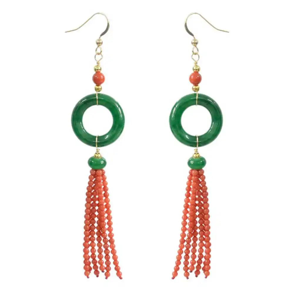 Natural Green jade Red coral beads Circle fringe Earrings FOOL'S DAY Lucky Ear stud Diy New Year Halloween Hook VALENTINE'S DAY