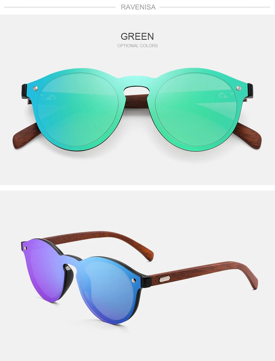 RAVENISA Vintage Round Wood Sunglasses Mono Green Lenses Sun Glasses For Men Women Wooden Eyewear