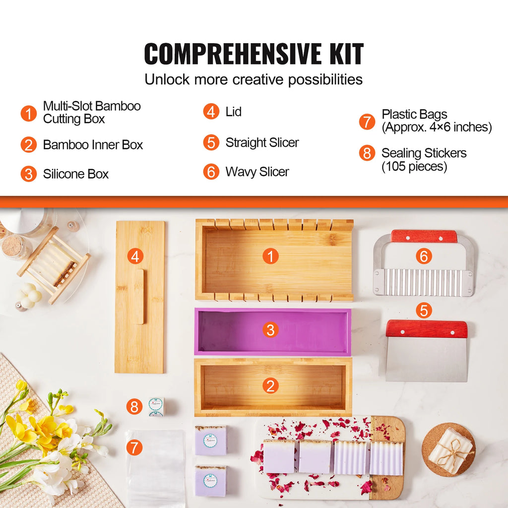 • Complete Soap Making Kit: Our supplies include a bamboo box, a silicone mold, 2 stainless steel slicers, 100 plastic bags, and 105 labeling stickers. Everything you need is in one package.