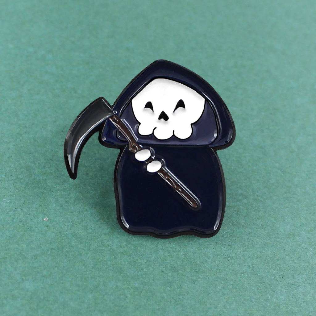 Cartoon Sickle Death Skeleton Pin Brooch Black Cloak Death Skull Button Enamel for Women Men Hat Bag Clothes Lapel Pin Brosche